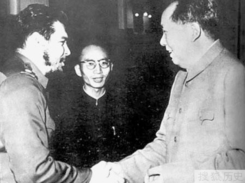 1960年11月17日,应中华人民共和国国务院副总理李先念的邀请,前往我国访问的古巴革命政府经济代表团,在古巴国家银行行长埃内斯托·切·格瓦拉少校的率领下,于11月17日到达北京。11月18日-12月1日,访问中国期间,受到了中共中央主席毛泽东,总理周恩来及副总理兼外交部长陈毅的接待。图为1960年11月,毛泽东主席接见来访的切·格瓦拉。