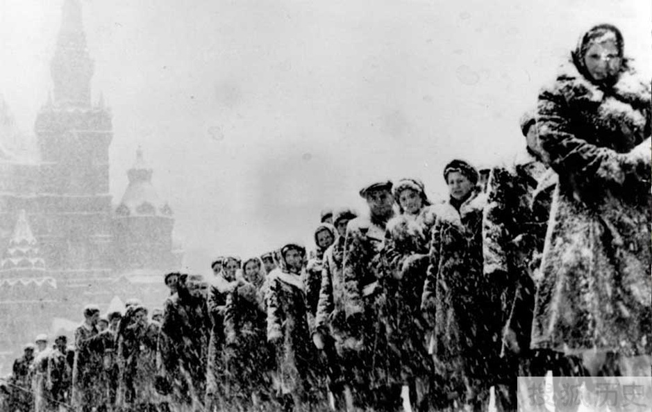 斯大林不顾列宁遗孀克鲁普斯卡娅的反对,在莫斯科红场建造列宁墓并将列宁遗体用现代防腐技术保存在水晶棺内供人瞻仰。列宁墓建成后成了红场的重要组成部分,同时也成为重大集会、庆祝游行的观礼台。此后,苏联领导人的殡葬逐渐形成严格的等级制度。图为苏联民众冒着大雪排队等候瞻仰列宁遗体。