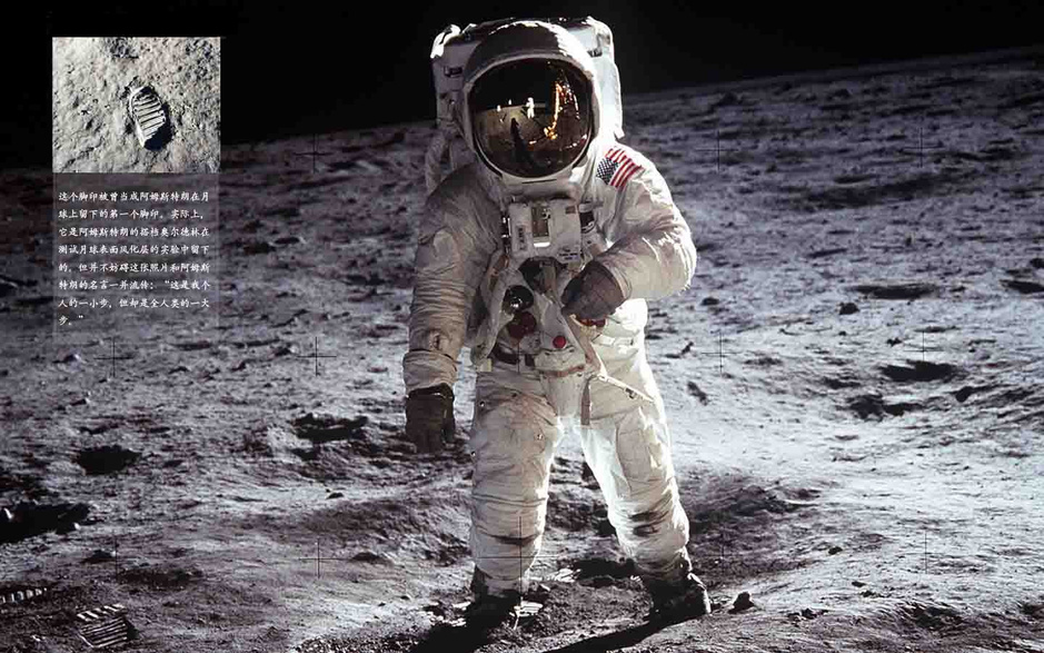 1969年7月 阿姆斯特朗留下人类在月球上的第一个脚印。这个脚印被曾当成阿姆斯特朗在月球上留下的第一个脚印。实际上,它是阿姆斯特朗的搭档奥尔德林在测试月球表面风化层的实验中留下的。但并不妨碍这张照片和阿姆斯特朗的名言一并流传:“这是我个人的一小步,但却是全人类的一大步。美国以此向苏联人宣示:在与苏联的这场竞赛中,美国取得决定性胜利。