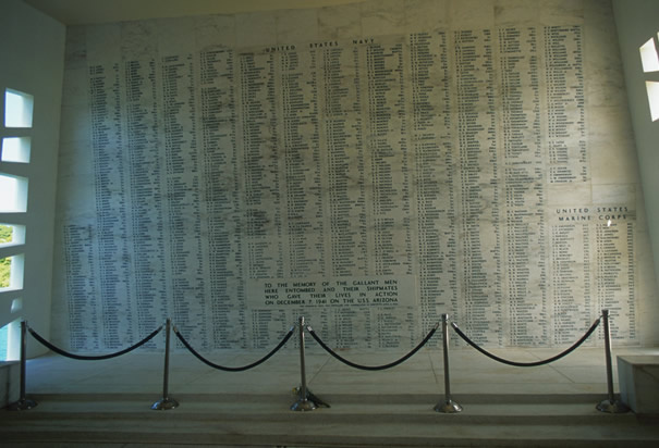 亚利桑那号战舰纪念墙:纪念馆内的纪念墙上刻着亚利桑那号战舰上阵亡海员的姓名。