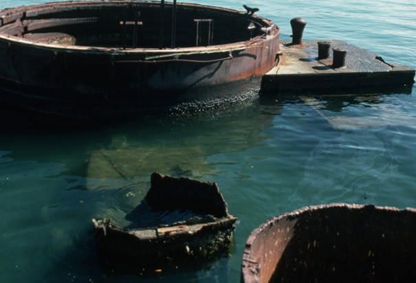 亚利桑那号战舰残骸:沉没的亚利桑那号战舰的顶部露出水面。