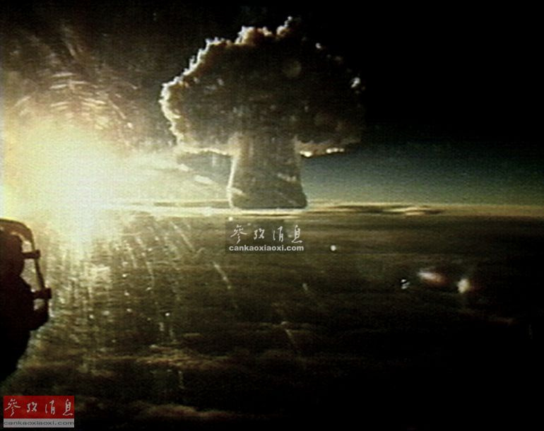 1961年10月30日,一架图-95轰炸机在北极新地岛群岛投下了“沙皇氢弹”,爆炸威力相当于广岛“小男孩”原子弹的威力的3846倍,产生的火球直径就长达4600米,爆炸产生的热风甚至可以让远在170公里以外的人受到3级灼伤,爆炸的闪光还能造成220公里以外的眼睛失明,冲击波绕地球飞行了3圈。美国地震局测到的爆炸震级相当于5级地震、将整个亚欧大陆向南推移了9毫米。图为苏军轰炸机在161千米外拍摄的”沙皇“氢弹爆炸后升起的巨型蘑菇云。